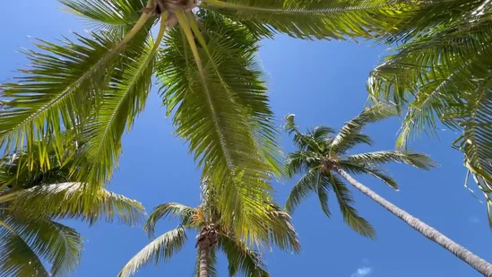 - Oasis tropical, palmeras que se mecen y abundante vegetación.
